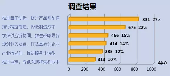 对于“规划业务流程、打造高效能企业”、“产业链延伸,推进服务化转型”以及“推进电商,降低采购和营销成本”投票结果不相上下,说明了中国制造业者对于业务流程和客户服务、以及开源节流、成本控制的重视程度。简单而言,电子商务可以帮助中国制造业者更好地实现供应链的协同,精确快速地传递供应链上下游间的需求信息,同时对于企业全球化的推进有着非常好的辅助作用,但是要充分实现其功效,还需要企业在自身建设上做好基础的管理。举个可能每个网购者都有的需求,但网购者下单是会非常关注什么时候能够拿到你心仪的商品,相当于电子商务中可供货量(Available To Promise)和物流运达(Estimated ToDelivery)的概念,着就需要企业在很多基础的管理中做到及时准确的信息采集,比如原材料的库存、在制品入库的计划预测、设备的保养计划和执行是否准确等等,如果放到整个供应链上会非常复杂和不可控。“推进服务化转型”也不是简单的做服务,卖出去的产品具体买到哪里了、使用的环境如何、售出产品采用的关键零部件的信息(如子供应商、产品序列号、承保年限等)都关乎到企业提供服务的成本和客户对于服务的满意度。这对于企业提供什么样的服务内容,需要在前期产品规划设计、供应链的管理和制造过程、销售环节的数据采集同样有着非常高的要求。